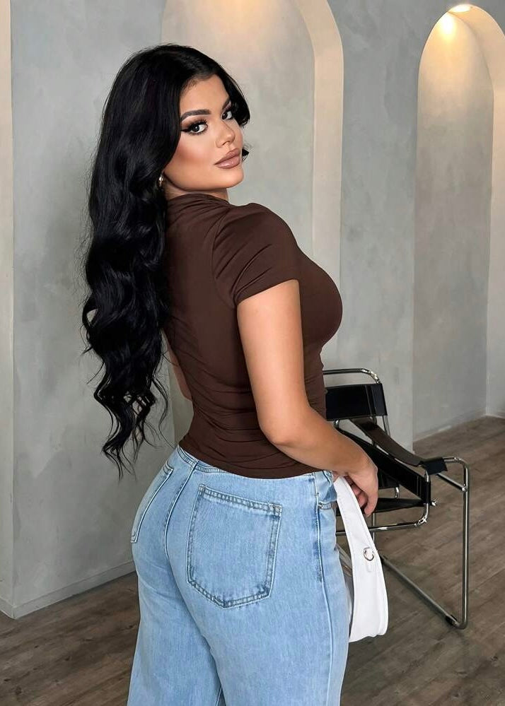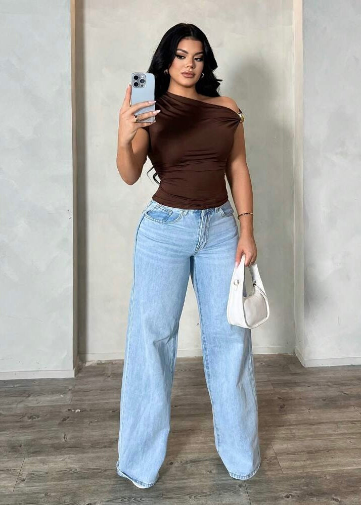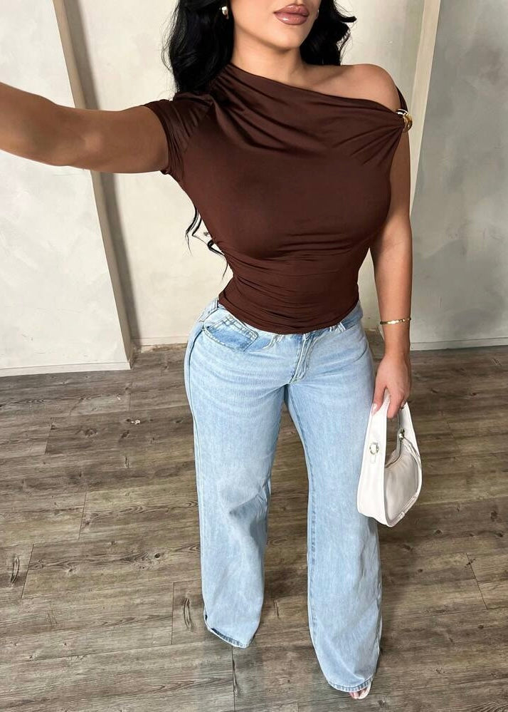 Effortlessly chic and subtly daring — the Tawny Asymmetric Top is your new go-to for elevated casual style. Designed in a rich chocolate brown hue, this one-shoulder top features a sleek asymmetric neckline adorned with a gold-tone clasp detail that adds the perfect touch of sophistication. The soft, stretch fabric hugs your curves while offering all-day comfort and a flattering fit.